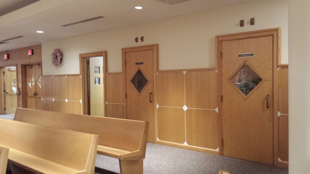 The confessionals are located inside the main seating area of the church on the east side of the room.
